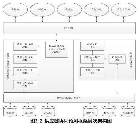 根据上述对协同框架流程特点和模型库方法建模的分析,可知基于多源数据的供应链协同预测框架需要兼顾数据层、方法处理层和应用层三个方面。因此,从三个层次的角度来看,本文提出的基于多源数据信息的协同预测框架具体如图3-2所示: