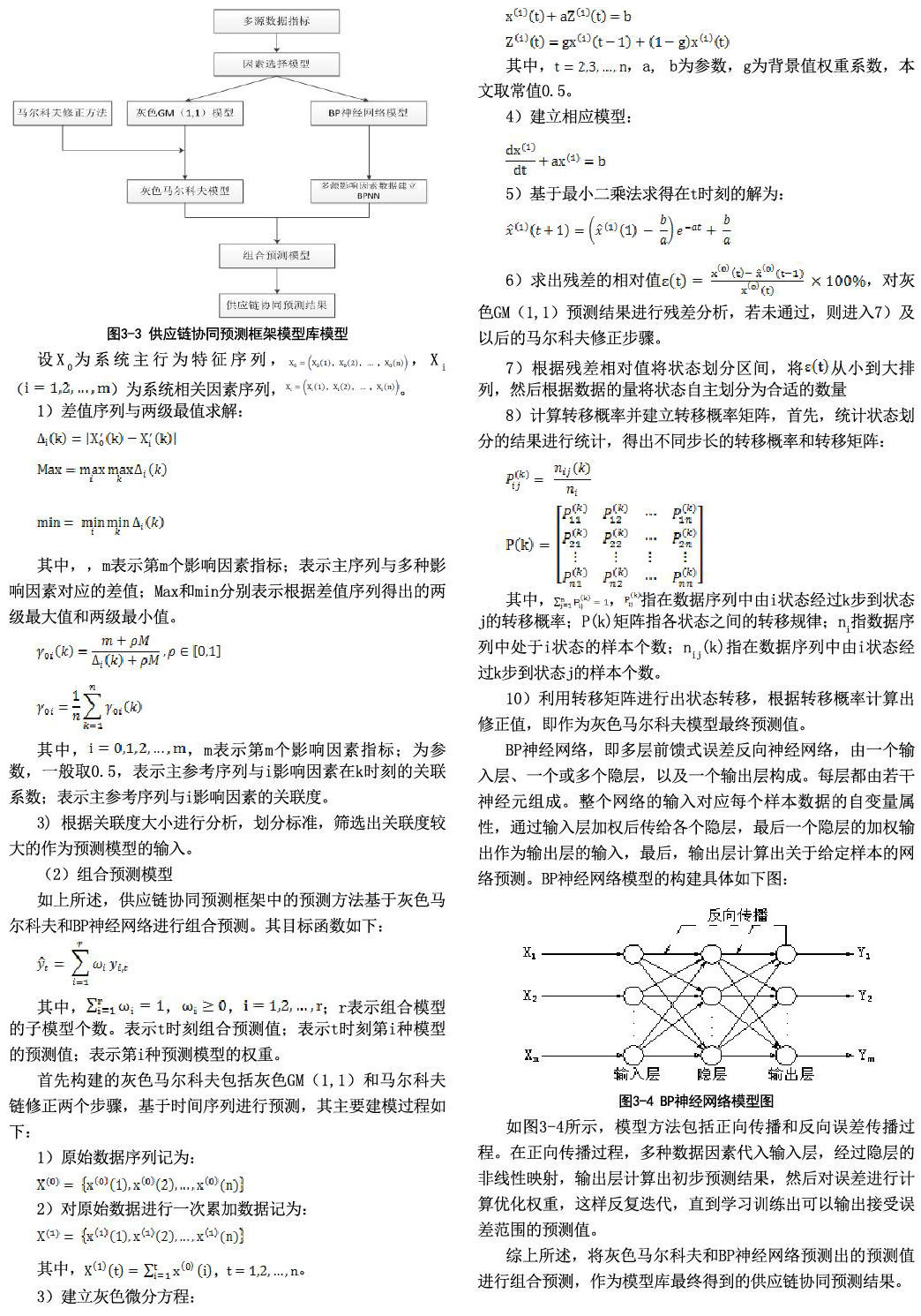 如上述框架图中所示,本文提出的供应链协同预测框架模型方法基于多源数据,首先通过因素选择模型分析选择出关联性强的的数据因素指标作为模型的输入。由于灰色马尔科夫基于时间序列进行预测,而BP神经网络可以基于多种关联影响因素来进行预测,因此,采用灰色马尔科夫和神经网络预测方法进行组合预测,综合考虑时间序列和多源数据影响因素进行预测。整体思路如图3-3: