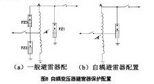 自耦变压器的防雷接线如图8(a),也可以采用图8(b)所示的避雷器保护方式。与8(a)相比,它可以节省避雷器原件,但引线比较麻烦,还需验算自耦绕组任一侧接地短路条件下,避雷器所承受的最高工频电压不应超过其灭弧电压。