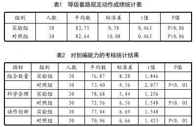 从表1的实验结果可以看出,两组学生等级套路规定动作技术的成绩差异