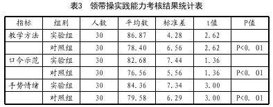从表3中统计结果可以看出,实验组学生在领操带操中成绩均高于对照组学生,表明通过教学实验培养了学生领操带操的实践能力。