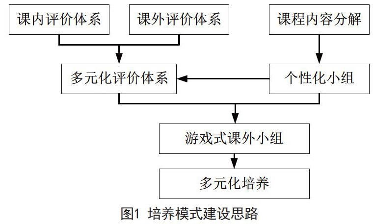 根据计算机专业特点,将学生的个性发展融入计算机专业教育,使得学生课外的娱乐活动更具针对性和学习性,根据学生个性重点突出学生某一方面的能力、拓展该方面的知识,将专业培养由面及点,由点及线,由线织网成面,增强学生就业隐性实力。此外,计算机类专业学生未来会从事软件开发相关工作,而软件开发对于团队协作精神的依赖不言而喻,将学生分为若干团队进行培养用以促进学生团队意识、协作素养的养成,而这些是课堂教学难以完成的。因此,构建相关的课内评价体系以及课外评价体系,这两方面将构成多元化评价体系的主体;此外由课程内容的多元化分解引出多元化培养,开展游戏式课外小组的组织,该组织将结合课外评价体系和多元化培养的目标进行验证,具体的培养模式建设思路如图1所示。