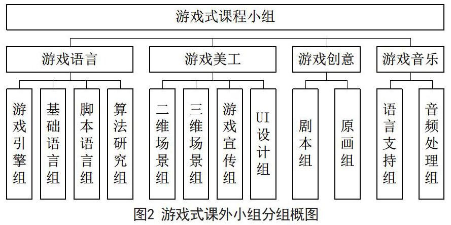 开展个性化教育需要以学生喜闻乐见的形式逐步进行,从大部分学生喜好网络游戏作为切入点,利用各学科教师的特长进行个性化教育。网络游戏是一把双刃剑,对于计算机专业来说,网络游戏又可以使学生开展针对性学习的契机。游戏本身具有学科交叉、学科融合等重要特点,是数学、物理学、艺术学、文学等学科交叉融合的结果,是可以有力开展个性化课外学习小组学习、科研、实践等活动的重要支撑。为完成课外学习小组的构建,从学生新生中挖掘学生个性进行针对性教育,并初步形成定势;在其它年级进行小组划分,成立相关小组,进行重点培养以及相关知识的拓展,以小组协作形式开展专业研究。根据计算机专业的特点,结合学生的个性发展的大方向将学习小组分为游戏语言、游戏美工、游戏创意以及游戏音乐等小组,而每个小组也同样根据小组个人的个性拓展为若干小组,并以小组为单位开展具体的学习、科研、实践等工作,具体小组划分如图2所示: