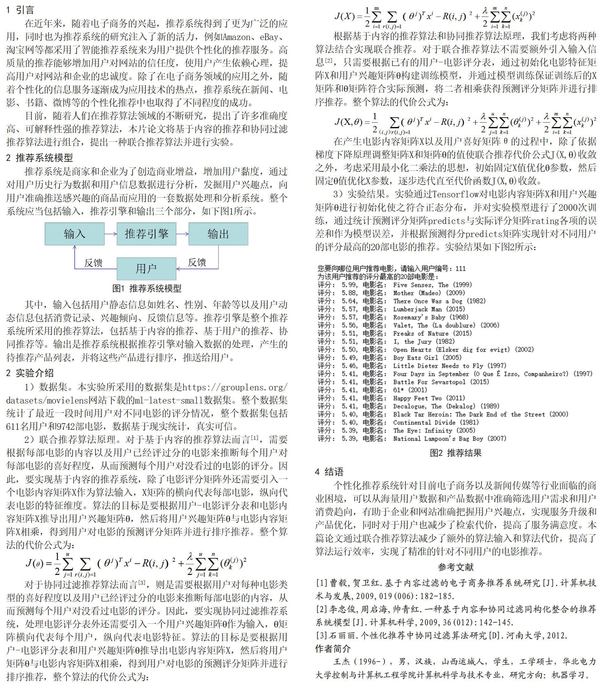 个性化推荐系统针对目前电子商务以及新闻传媒等行业面临的商业困境,可以从海量用户数据和产品数据中准确筛选用户需求和用户消费趋向,有助于企业和网站准确把握用户兴趣点,实现服务升级和产品优化,同时对于用户也减少了检索代价,提高了服务满意度。本篇论文通过联合推荐算法减少了额外的算法输入和算法代价,提高了算法运行效率,实现了精准的针对不同用户的电影推荐。