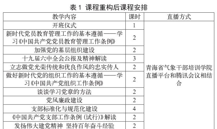 突如其来的新冠疫情给青海省气象部门培训带来了巨大影响,日常的工作学习和生活状态都被迫改变了以往的模式,给传统的线下集中统一面授模式带来了很大的挑战,但是遵循着“停课不停学”的宗旨,青海省气象干部培训学院对气象部门的培训进行了课程重构,将原本面授实施方案中的课程转变为线上直播,在2021年党务干部培训班采用了全程“在线直播”授课模式,首次实现了此班型“线下培训”为“线上培训”的转变。现以2021年11月开展的党务干部培训班为案例进行分析,并在此基础上提出建议为今后的类似培训班提供新思路。