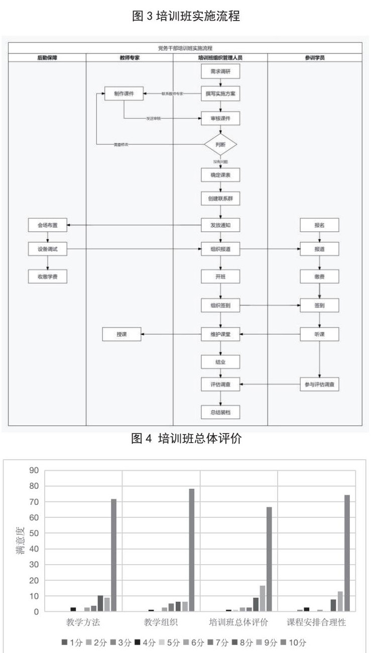 培训班加强了培训全流程精细化管理,精化每一个管理工作环节,畜力提升组织管理人员的责任意识、细节意识、规范意识和服务意识[7]。培训班经过了前期的需求调研、撰写实施方案和确定课程,最终如期开班,期间班主任即培训班组织管理人员维护课堂正常进行,最后结业进行了评估调查。具体过程如图3: