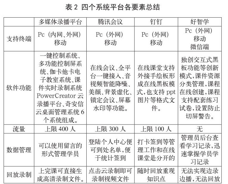 直播技术发展至今出现了各种不同的直播教学软件应用,从中选取一个最为适合气象培训的成为了一个难题,现对培训学院自己的直播平台、腾讯会议、钉钉和好智学在线培训系统四个系统各方面总结如下表: