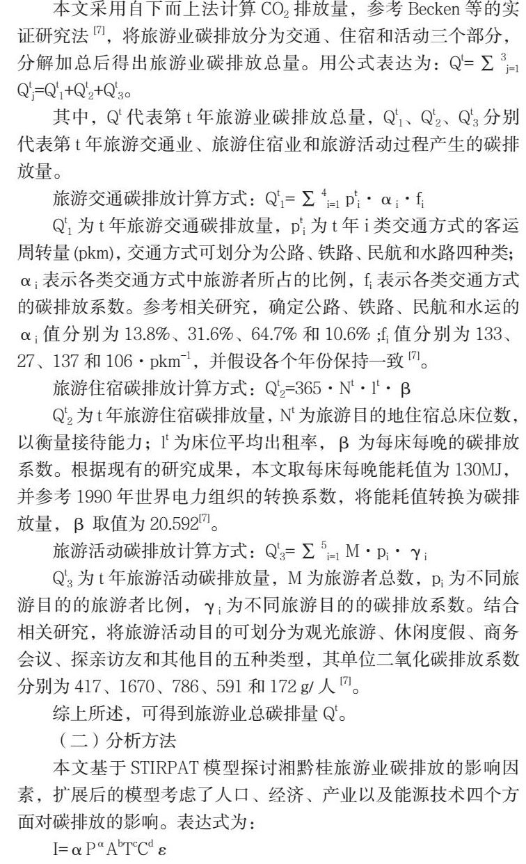 综合来看,国内外学者对碳排放问题做了大量研究,但鲜有少数民族地区旅游的视角。广西、湖南、贵州三省是侗族主要的聚居地,旅游资源丰富,将来有望以民族特色为支撑,发展全域旅游。本文以三个省份为研究对象,在总体测算1996-2019年湘黔桂地区旅游业二氧化碳的基础上,并运用STIRPAT模型对影响因素进行了分解,以期为未来旅游业低碳发展政策提供科学依据。