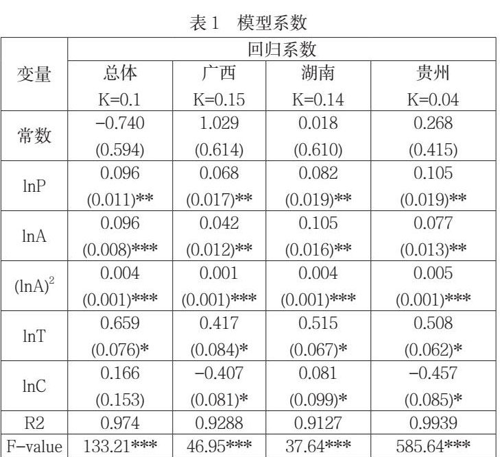 为解决多重共线性问题,本文采用岭回归进行分析。岭回归是一种专门用于共线性数据分析的有偏估计回归方法,其舍弃了最小二乘法的无偏性而丢失部分信息,但能够使回归系数估计更为符合实际。对方程进行岭回归分析,以步长为0.01对岭回归系数K进行检验,并得到模型可决系数和变量。可见当k=0.1、0.15、0.14和0.04时,回归系数趋于平稳。具体岭回归结果如表1所示,除常数项外,其他岭回归系数和F统计量基本通过了显著性水平检验,R2都大于0.9,整体拟合效果良好。因而该模型很好地解释了湘黔桂旅游业碳排放与其影响因素的关系。