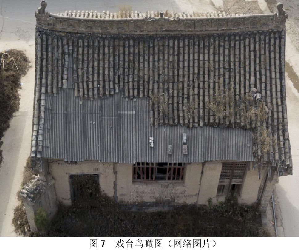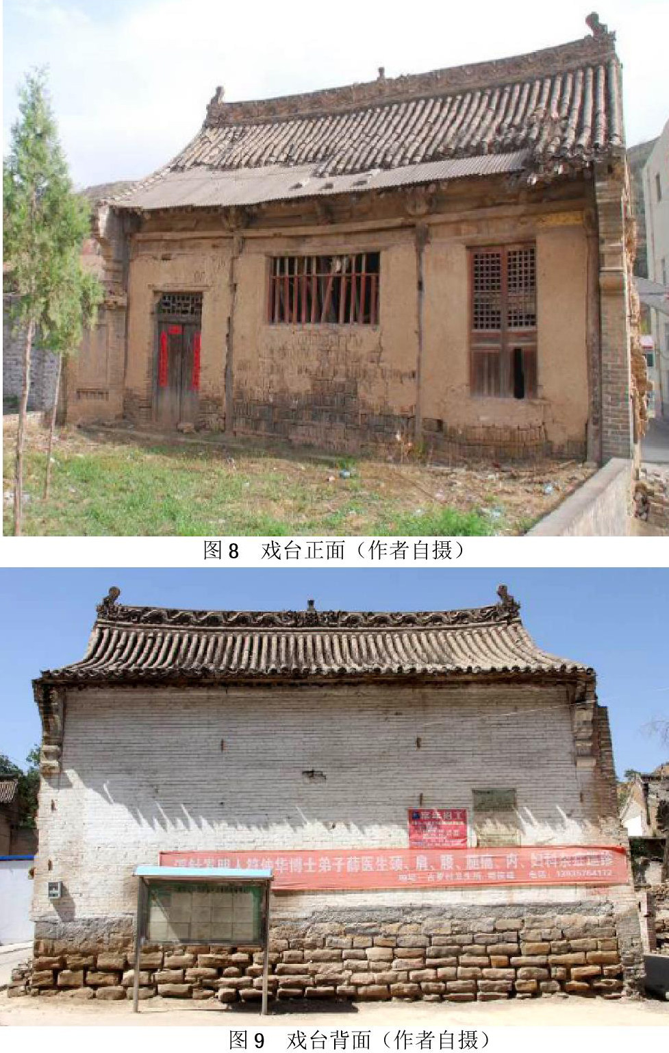 戏台砖砌台明,条石包边,高0.3米(台前于后期填高)。面阔三间,进深四椽,单檐硬山顶,脊饰完好。台前两侧设外八字影壁,西侧影壁现不存如图7、8.9所示。台内梁架有彩绘,前后台设木板相隔,楣书“声徹云霄”。该戏台于上世纪80-90年代用作压油作坊。戏台结构古朴,是研究晋南戏台建筑的实例。