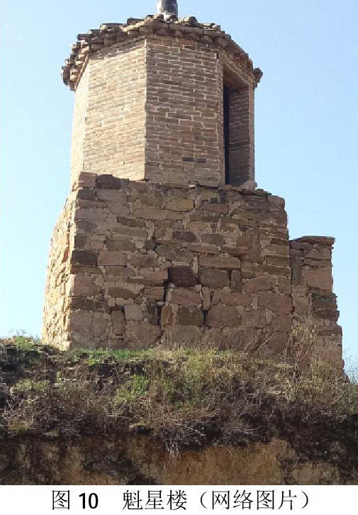 魁星楼位于村东南约100米处南山顶上,坐东面西。创建年代不详,据结构分析为清代所建。二层砖木构建筑,通高约5米。一层为方形砖砌高台,边长约3.4米,二层为砖砌圆柱体,直径约1.2米,攒尖顶。西侧设门。屋檐为三层叠涩砖出檐,第二层砖檐为斜出牙子,如图10所示。该建筑造型别致,是研究当地风俗的实物例证。