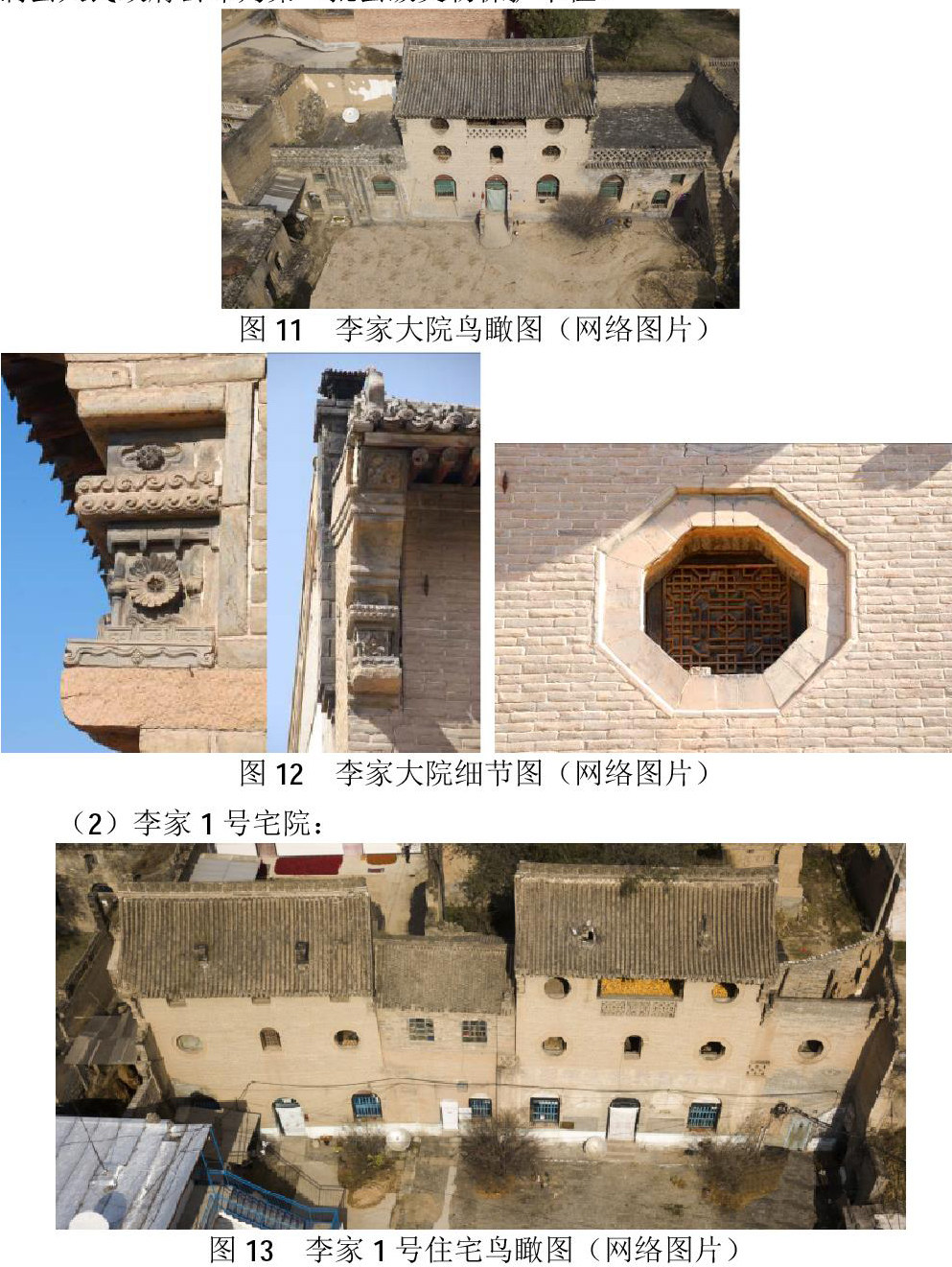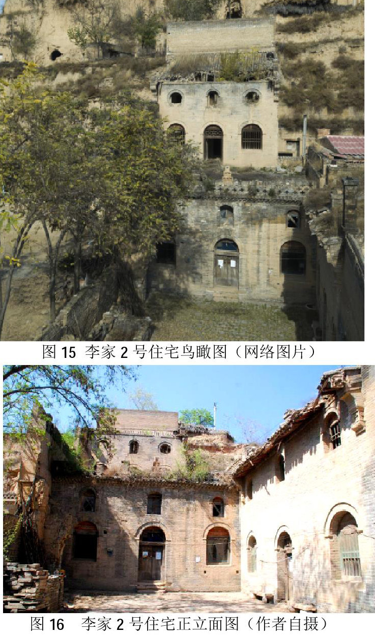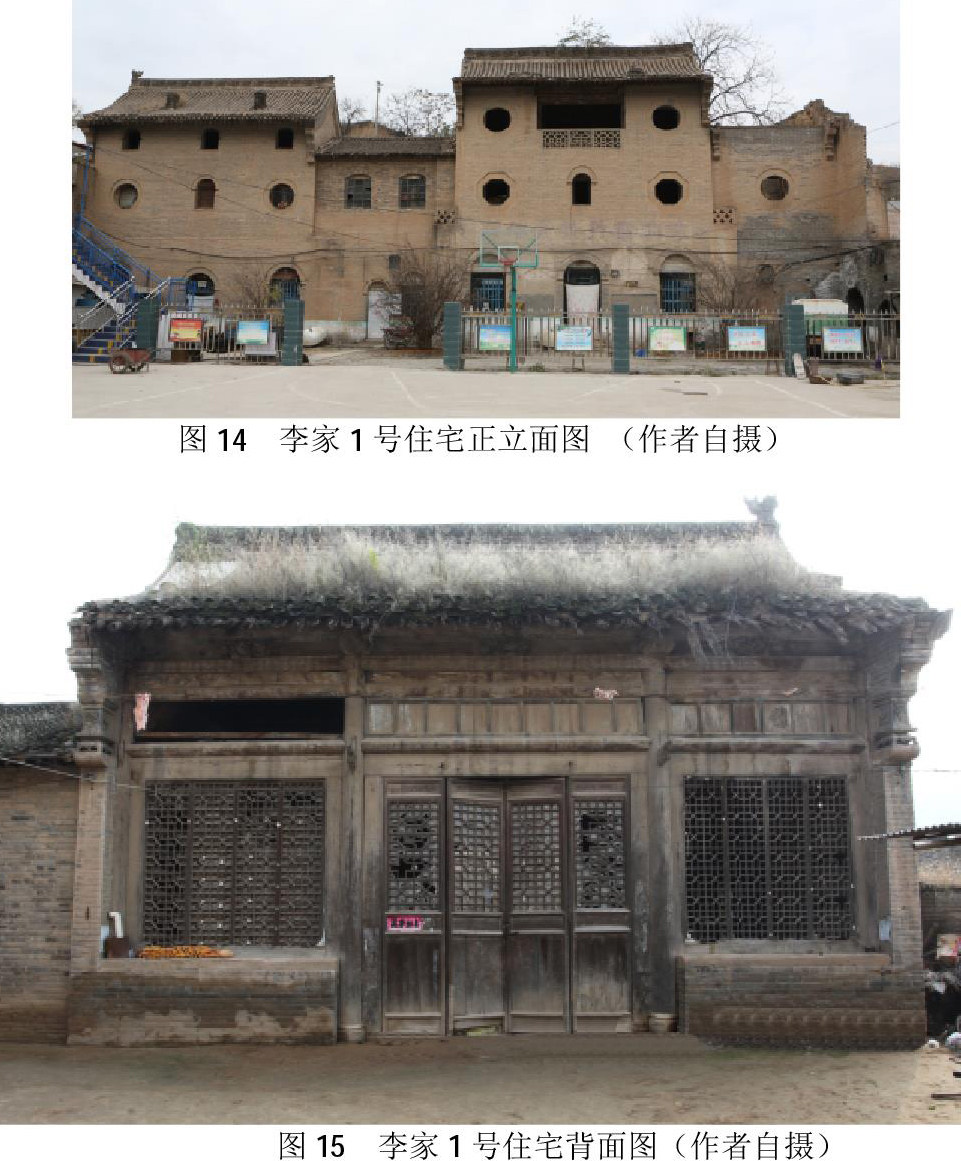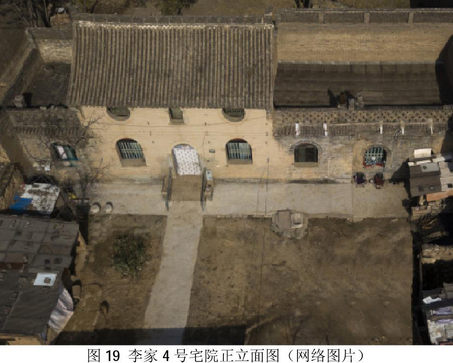 李家大院坐北朝南,占地面积822.9平方米。北房脊檩题记:“时大清道光二十六年(1846)……上梁。”现存正房、东西耳房,房间共9间。正房为砖木构三层楼阁式建筑,面阔五间,进深三椽,单檐硬山顶,四檩无梁式构架,后檐墙设神龛。东、西耳房原为二层,现存下层,均为砖窑2孔,如图11所示。该院建筑结构古朴典雅,富有地方特色。1985年被洪洞县人民政府公布为第二批县级文物保护单位。