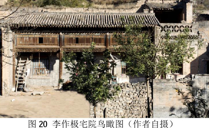 宅院坐北面南。占地面积521.1平方米。创建年代不详,正房脊檩题记:“时大清道光二十二年(1842)……重修,主人李作极。”现存建筑为清代遗构。原为一进四合院布局,现存正房、东耳房,共6间,其余建筑不存。正房为“明三暗五”式结构,明次间为砖木构二层,以木质垫板相隔,面阔三间,进深四椽,硬山顶,五檩无梁式构架,前檐墀头砖雕花卉;两梢间均为砖窑1孔,平顶,前设花墙。东耳房为砖劵枕头窑1孔,平顶,如图20所示。
