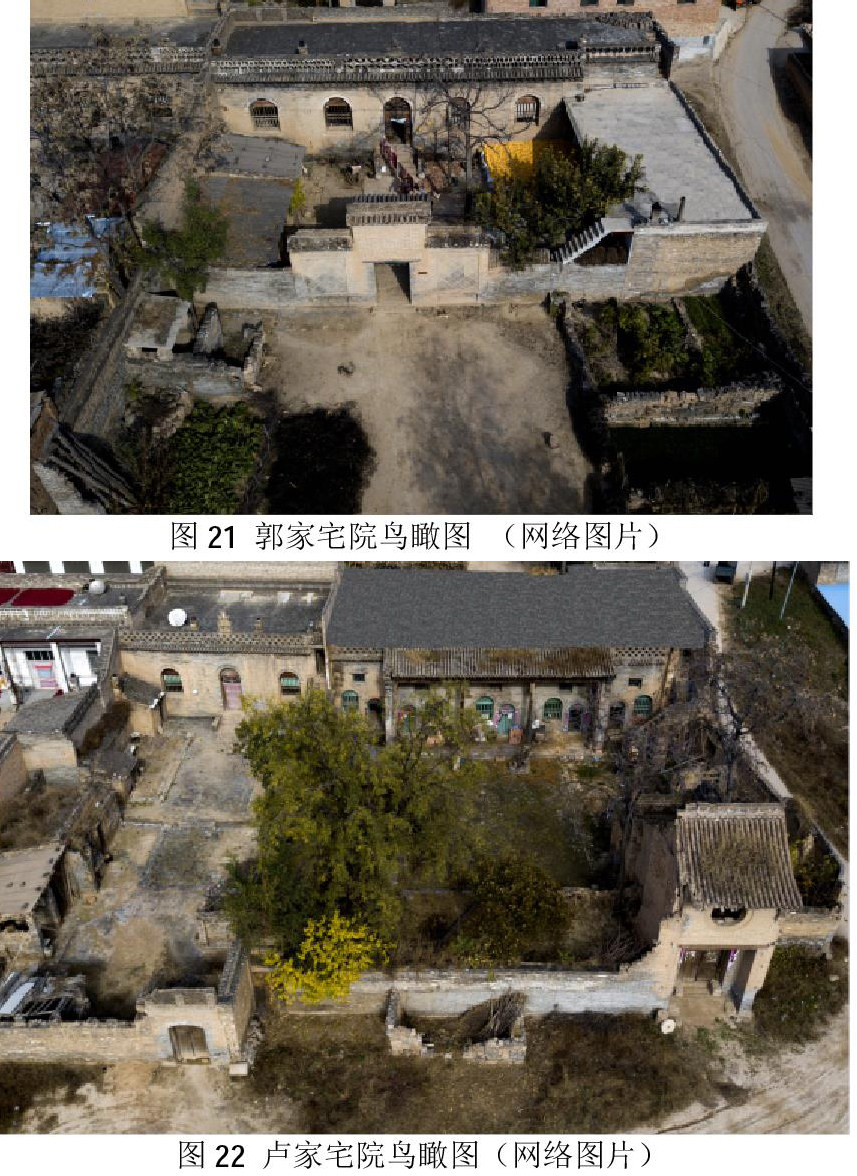 宅院坐北面南。占地面积583.7平方米。据现房主介绍,该院原为郭姓村民创建。创建年代不详,据形制分析为清代建筑。原为一进四合院布局,现存大门、正房、东耳房(砖劵枕头窑1孔),其余建筑不存。大门面阔一间,进深二椽,三檩后廊式构架,额枋施有彩绘。大门两侧各设影壁1面。正房原为二层,现存下层砖窑5孔,平顶,前设花墙,前檐砖雕仿木檐,如图21所示。