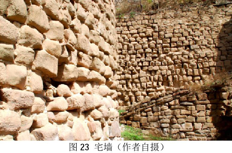 上寨村古时有军寨,四周驻防以防外敌、野兽侵入,后军寨废弃,民户陆续入住寨内,故名上寨。寨墙,村庄南部临沟为防御外敌入侵修建,全部用规格石头砌成,现古寨墙仍有部分遗留,如图23所示。