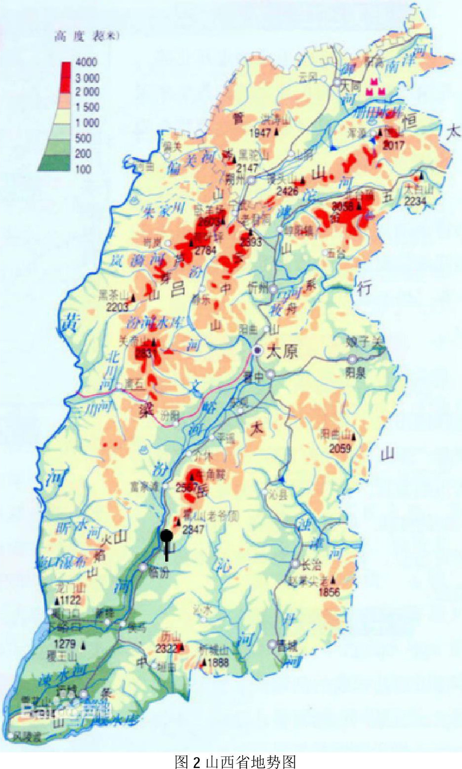 上寨村是城堡式的村落,枕山临水、依山而筑,南部临沟设有堡墙。东西古驿道从村南穿过,东西两头分别设东西村门(现留有遗址),西村口建有张氏节孝坊,街道为两米宽条石路。为防御外敌侵入,设寨墙,全部用规格石头砌成。 图2山西省地势图
