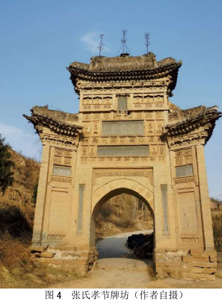 该牌坊为四柱三楼砖砌牌坊,高约14米。石砌底座,高0.5米,如图4所示。明楼下券拱形门,上置花板三重,花板内雕人物、花卉。上设平座并砌仿木楼阁建筑,面阔七 图4 张氏孝节牌坊(作者自摄)
