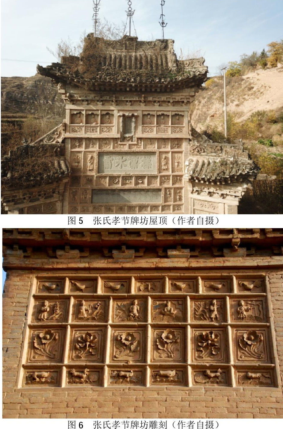 间,歇山式顶, 前设廊及栏板,檐下斗拱三踩单翘,明间设匾额,其余每间各雕人物一尊。正楼匾东西两面分别书“圣旨”、“荣增翟茀”、“操凛冰霜”,如图5所示。两次楼呈“八”字影壁,额枋施三踩单翘斗拱,下设四个方形花板,内雕人物、花卉,如图6所示。张氏节孝坊结构别致,雕刻细腻,具有较高的历史、艺术、科学价值。