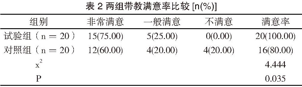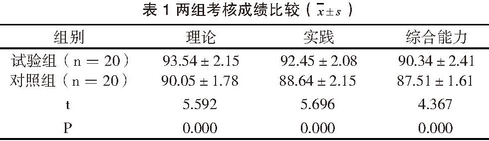 选择骨科实习护生40人,带教时间2021年6月-12月。随机数字表法分成两组,对照组20人,全部为女性;年龄21-25岁,平均(23.34±0.34)岁;学历:本科9人、大专11人。试验组20人,全部为女性;年龄21-25岁,平均(23.40±0.33)岁;学历:本科10人、大专10人。