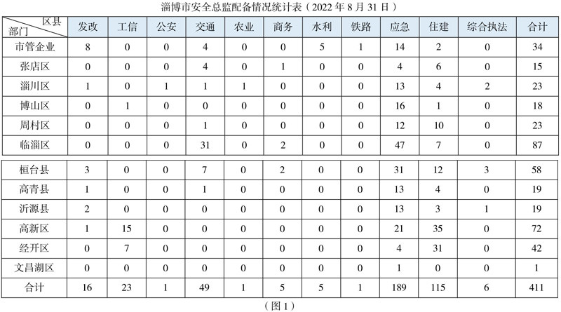 《山东省安全生产条例》第21条规定,从业人员100人以上的高危生产经营单位和从业人员300人以上的其他生产经营单位,应当依法设置安全总监。法律法规明确规定了需要设置安全总监的行业类型和经营规模,主要还是以100人以上的高危生产经营单位和从业人员300人以上的其他生产经营单位为主。因此,从法律规定就可以看出,需要设置或配备安全总监的企业数,基本上就代表了一个地区、一个行业内高危经生产经营单位和规模以上工贸企业数量。经初步统计,截至2022年8月31日,淄博市各行业领域安全总监应配尽配企业数为411家(见图1),说明淄博市是一个产业大市、化工大市,高危经生产经营单位和规模以上工贸企业总量较大,尤其是危险化学品生产、经营、运输企业多,化工行业所占比重,安全监管任务艰巨重大。