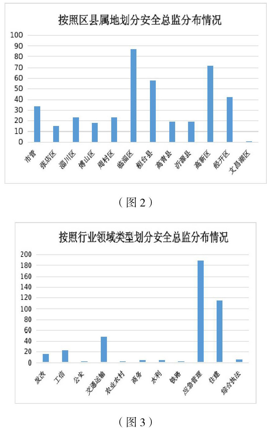 (一)从区县属地分布情况来看(图2)。市直管企业34家,张店区15家,淄川区23家,博山区18家,周村区23家,临淄区87家,桓台县58家,高青县19家,沂源县19家,高新区72家,经开区42家,文昌湖区1家。其中,临淄区数量最多,占比最高,为21.2%;其次高新区,占比为17.5%;再次桓台县,占比为14.1%;临淄区、高新区、桓台县三个区县,应配尽配安全总监企业数占到了全市的52.8%。以上数据分析说明,淄区、高新区、桓台县三个区县域内高危企业和规模以上工贸企业数量多,占比高,监管责任重、压力大。