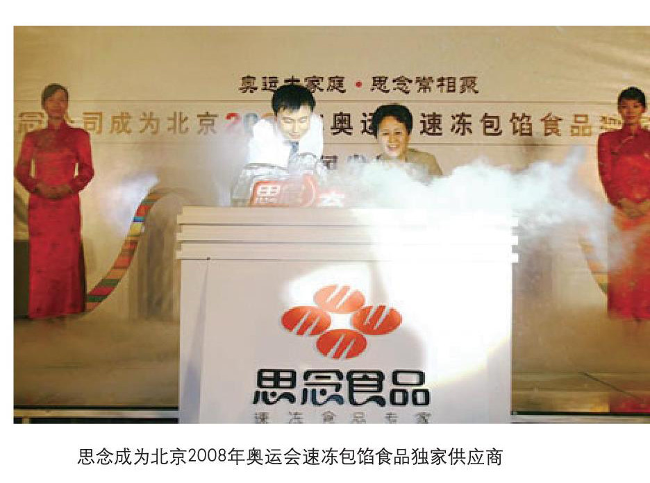 思念食品,注定成为中国速冻食品业耀眼的一匹黑马。2006年8月思念在新加坡交易所主板成功挂牌上市,成为国内第一家上市的速冻企业。在2008年北京奥运会的盛宴中,以独辟蹊径的方式成了“北京2008奥运会速冻包馅食品独家供应商”,把中国的饺子推向了世界。