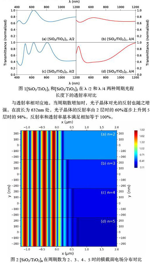 在此基础上,我们搭建了仿真模型,并计算光的透射和光场分布。类似地,我们将每个薄膜的尺寸设置为2μm×2μm,根据上述关系计算出每一层的厚度,然后将两种材料的薄膜交替排列。研究中,我们分别对比了周期数为2和4的两种情况,即将两种材料组成的薄膜重复2次或4次,如:[SiO2/Si]n,n=2或4。以Si和SiO2为例,根据λ/4波长以及两种材料的折射率,我们可以定义每一层Si和SiO2的厚度为39.5nm和105.3nm。随后,我们放置了垂直于多层膜的平面光源,选择了其中波长在400nm和1200nm内的区间作为观测波段,并搭建了两个平行于薄膜和一个水平平行于光源的监测器来获取多层膜结构对于光的透射率、反射率谱和光传播过程中的电场强度。