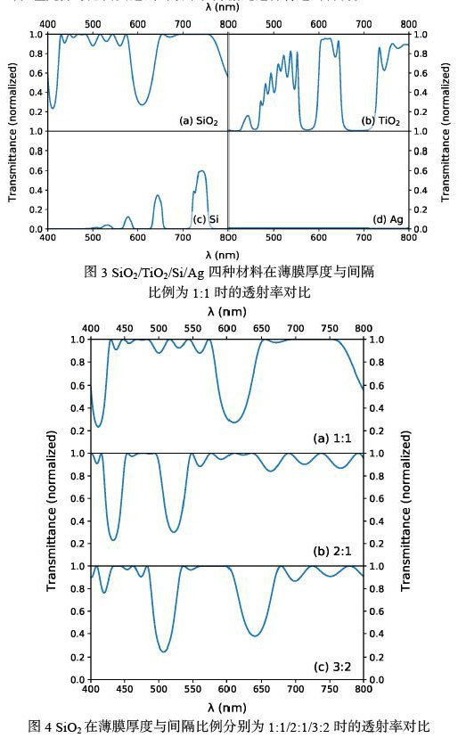 在这一实验中,我们分别选用了银(Ag)、硅(Si)、二氧化硅(SiO2)以及二氧化钛(TiO2)四中材料。对于每一种材料,我们同样将每个薄膜的尺寸设置为2μm×2μm,但是将其厚度依次改变,使得薄膜厚度与薄膜之间间隔的比例依次为1:1,2:1,3:2。我们将材料与间隔设为一组,每次实验将其重复4次,即4层薄膜,中间3层间隔。