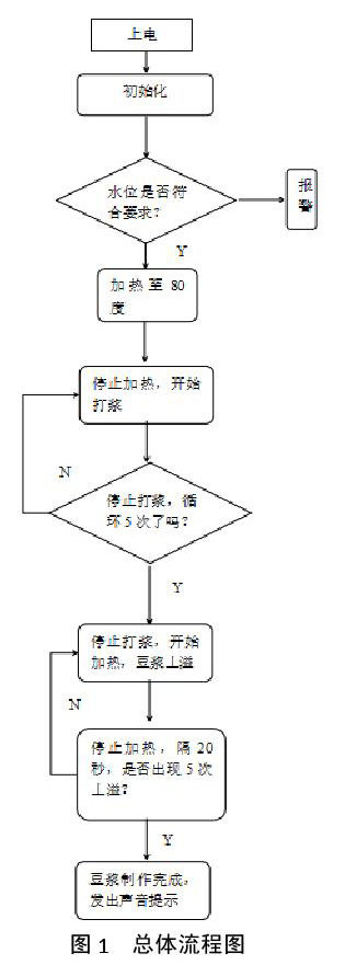 接通电源后,点击启动按钮,加热装置运行,于此同时温度传感器持续监测容器内的水温,当温度上升到80摄氏度左右时,单片机控制加热装置停止加热。然后电动机转动开始间歇式打浆工作,即打浆20秒停止5秒,如此循环5次后停止打浆。然后单片机控制加热装置继续工作,随着温度上升,豆浆丄溢,当液位检测仪的超声波检测到液位超过一定液位值时,再次停止加热,间隔20秒后继续加热,反复循环5次后,报警装置发出提示信号,豆浆制作完成。