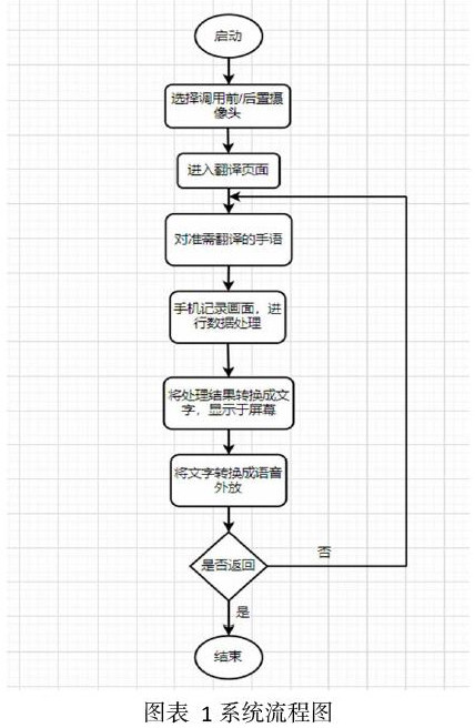 该手语翻译器通过调用手机前置或后置摄像头,记录并识别出用户的手语动作,将分析处理后的数据转换成相应的音频或文字文件输出。具体系统流程图见图表一,。