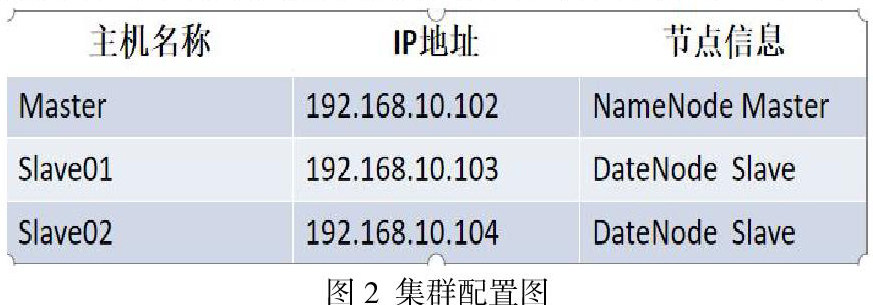 本文的实验平台基于VMware进行搭建,实验环境是CentOS7操作系统,在操作系统上搭建Hadoop集群。集群主要包括一个主节点和两个从节点。每个节点上的实验环境相同,最后在集群上运行MapReduce并行化协同过滤算法,对不同的推荐算法进行实验并比较。集群的配置如下: