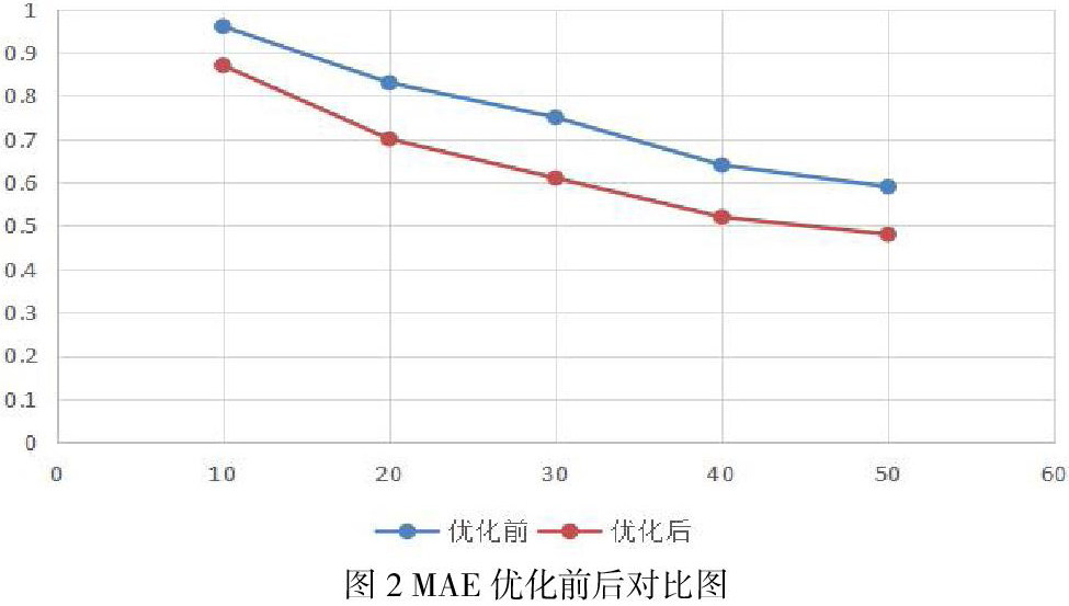 基于本文提出的对稀疏矩阵进行优化处理后得到的矩阵,与未优化的矩阵进行对比运算。本文用实际评分与预测评分值之间的差值平均绝对偏差MAE[10]作为评价指标来反映算法的准确性,公式如下: