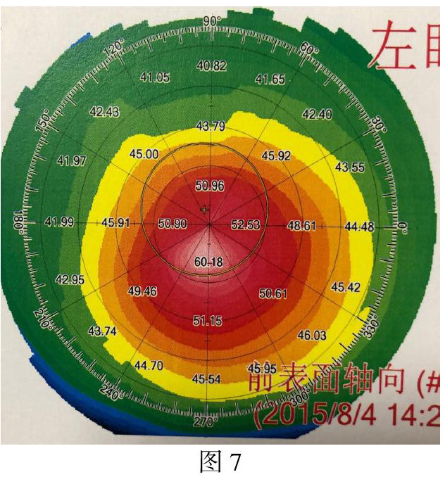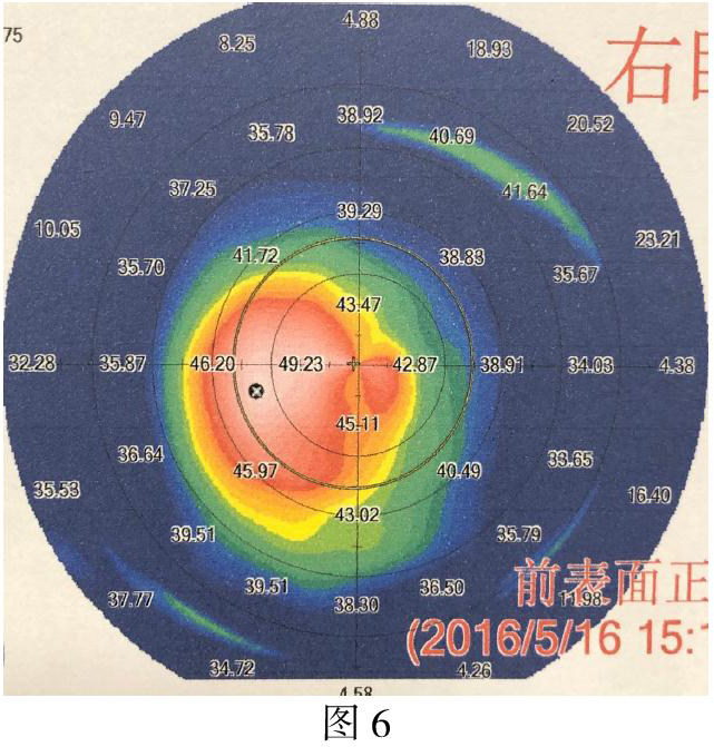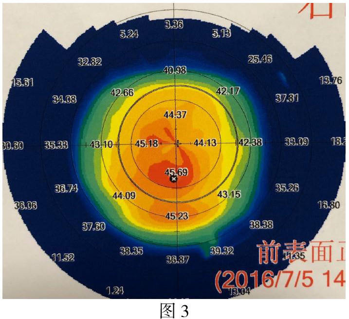 2、可疑圆锥角膜 见图3(亚临床期)有圆锥角膜发展趋势,但不一定会发展为圆锥角膜