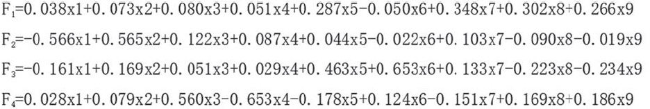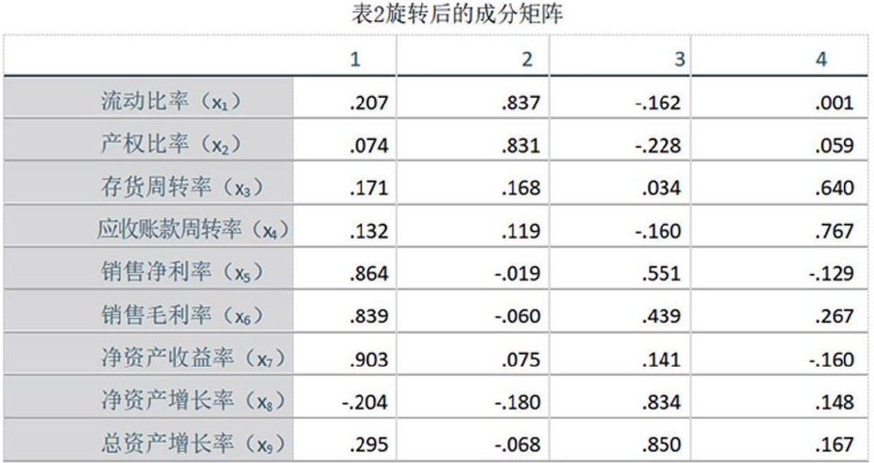公共因子F1在x5、x6、x7上具有较大的载荷系数,其主要体现盈利能力指标,因此可以将该因子命名为“盈利因子”;公共因子F2在x1、x2上具有较大的载荷系数,其主要体现偿债能力指标,因此可以将该因子命令为“偿债因子”;公因子F3在x8、x9上具有较大的载荷系数,其主要体现发展能力指标,因此可以将该因子命名为“发展因子”;公因子F4在x3和x4上具有较大的载荷系数,其主要体现营运能力,因此可以将该因子命名为“营运因子”。