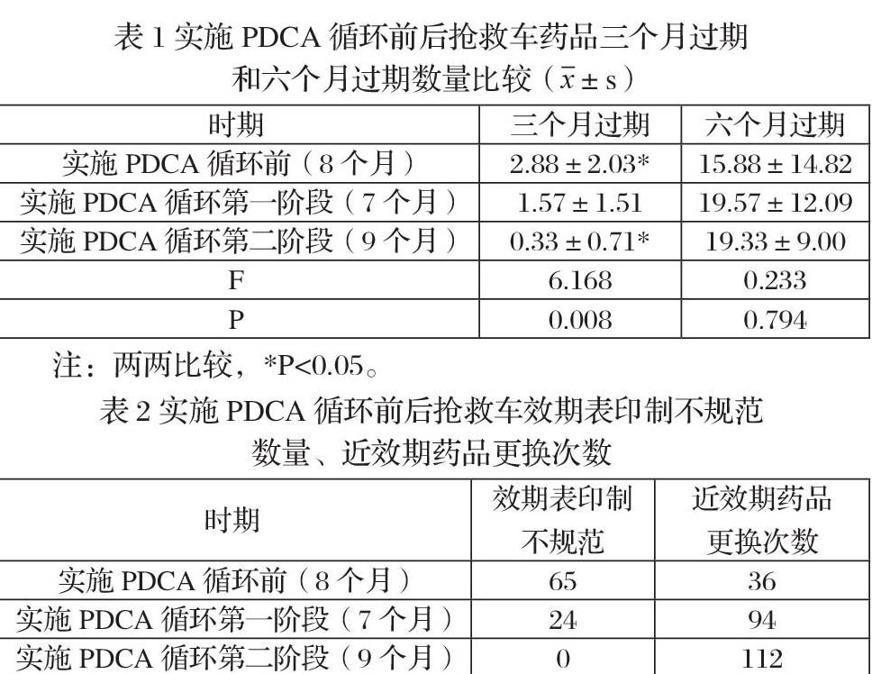 2.2 实施PDCA循环前后抢救车效期表印制不规范数量、近效期药品更换次数见表2。