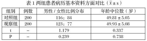 2019年12月份至2022年1月份期间,遵循信封随机分组法将400例患者划分至对照组、观察组各200例,两组患者性别、年龄资料方面呈P>0.05,详见表1: