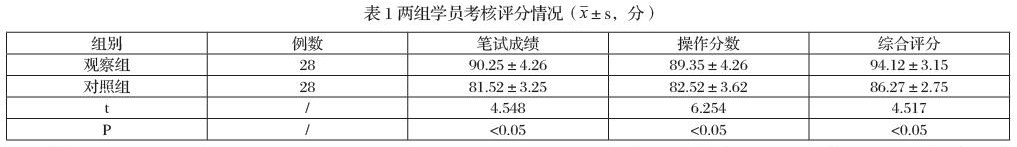 观察组培训人员的考核评分均高于对照组(P<0.05),见表1。
