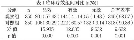 治疗总有效率观察组98.57%,对照组90.86% ,P<0.05。