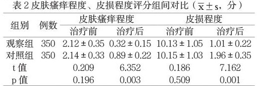 治疗前2组的皮肤瘙痒程度、皮损程度评分均较高P>0.05,治疗后皮肤瘙痒程度、皮损程度评分观察组较对照组更低P<0.05。