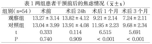 两组患者术前及术后24h的焦虑情况均无统计学差异,P>0.0.5。患者术后1月、3月后的焦虑指数水平与对照组相比,低于对照组,差异显著,P<0.05。见表1。