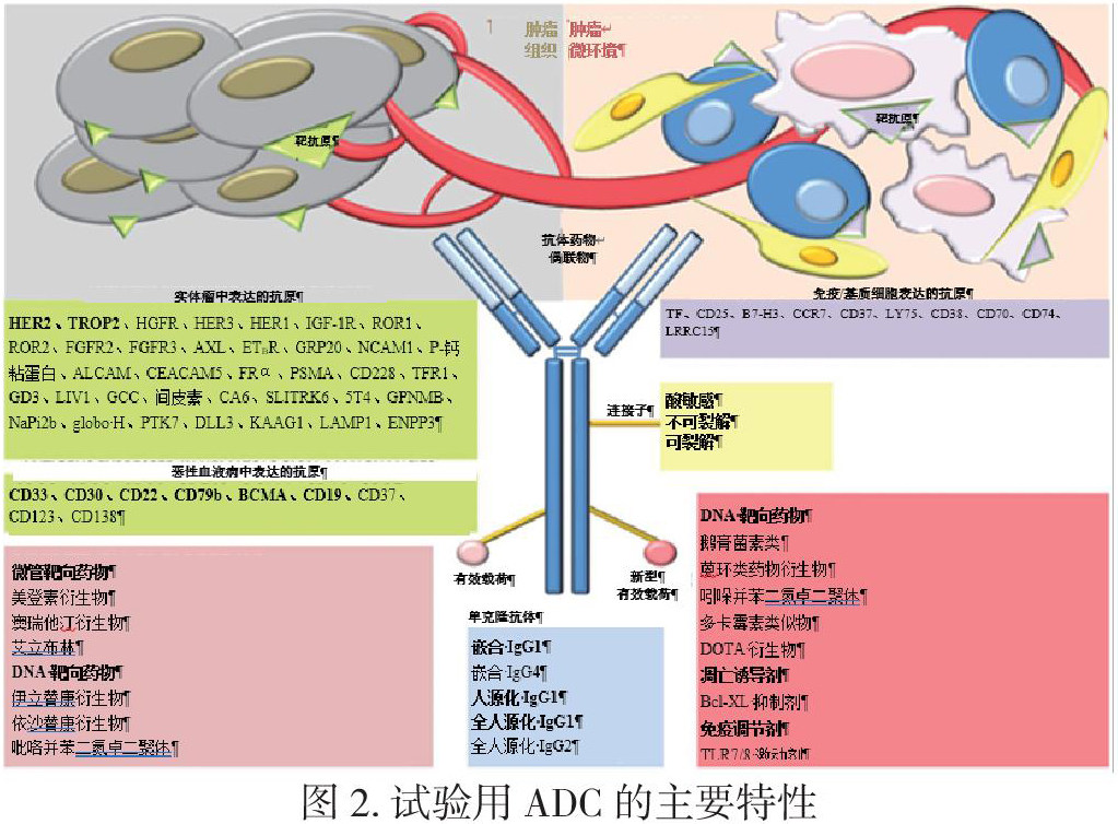 注:达到临床研究阶段的实验性 ADC 可能具有与已获批 ADC 相同的靶抗原(此类抗原在绿框中以粗体表示),或可识别通常在实体瘤表达的新型肿瘤相关抗原 (TME)(此类抗原在绿框中不以粗体表示)或由肿瘤微环境中存在的免疫/基质细胞表达的新型肿瘤相关抗原 (TME)(紫色框)。这些 ADC 中的少数药物靶向新出现的细胞谱系特异性抗原(这些抗原由某些恶性血液病选择性表达)。与已获批的 ADC 一样,通过酸敏感、不可裂解或可裂解连接子将 mAb 部分连接到具有细胞毒性的有效载荷上。在大多数情况下,试验用 ADC 递送的细胞毒性化合物与已获批 ADC 所递送的化合物的不同(常见有效载荷列在粉色框中;新型有效载荷列在红色框中)。试验用 ADC 的 mAb 成分包括嵌合、人源化或全人源化 IgG1、IgG2 或 IgG4(也存在于已获批 ADC 中的常见 IgG 亚类以粗体表示)。