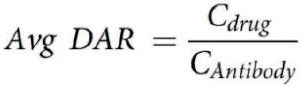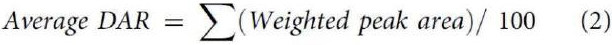 质谱法(MS)是另外一种常用的分析DAR的方法。目前使用包括电喷雾电离质谱(ESI)、飞行时间质谱(TOF)或Orbitrap,以区分ADC的异质分子种类。根据质谱测定的分子量及相应峰面积等,使用以下公式计算平均DAR。