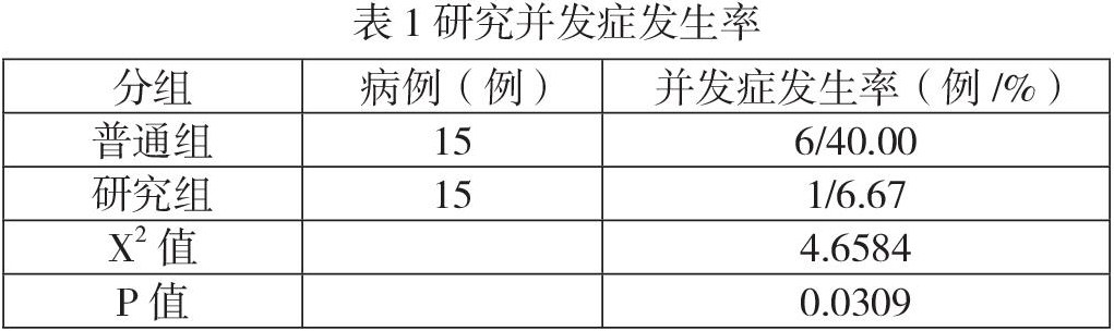 研究组的并发症发生率6.67%,同普通组的40.00%比较更低(P<0.05)。见表1。