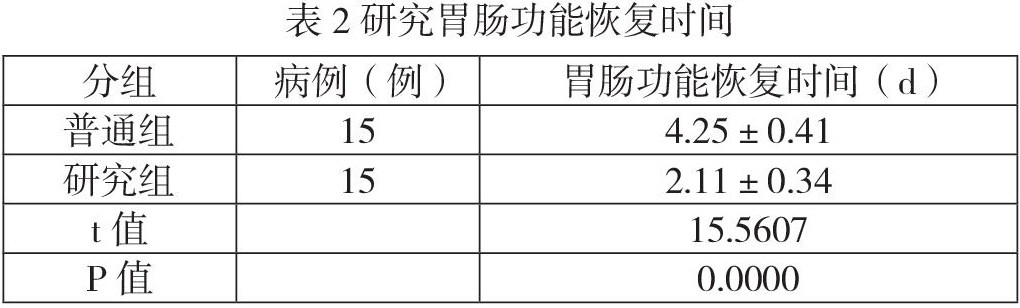 护理后,研究组的胃肠功能恢复时间(2.11±0.34)d,同普通组(4.25±0.41)d比较更短(P<0.05)。见表2。