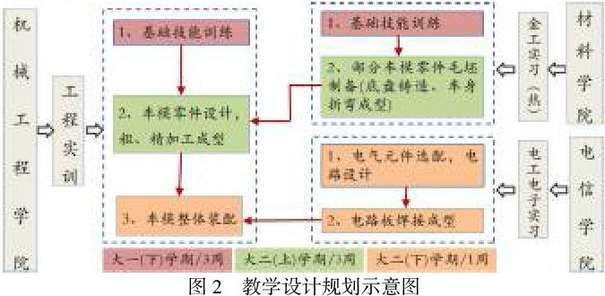 基于智能车模的工程实训教学模式是以机械学院为主导,将工科院校的机械、材料、电子等专业进行多学科融合的实践教学项目。通过智能车模项目将机械专业主导的冷金工实习、材料专业主导的热金工实习以及电子与信息工程学院主导的电工电子实习等三大工程实践课程进行有效结合,培养学生综合应用各学科专业知识解决工程实际问题的能力。基于智能车模的工程实训教学设计规划示意图如图2所示。