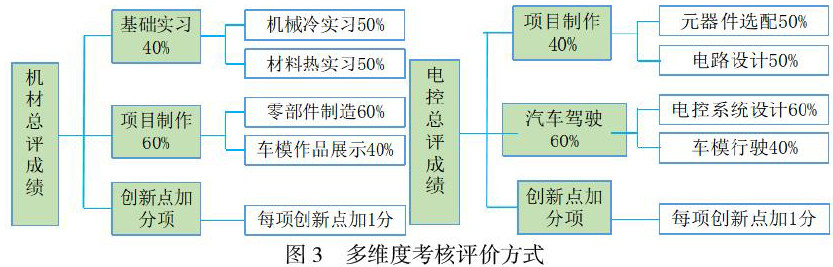此外,为培养学生的创新能力,设置有加分项,包括:车身造型设计、各类附件设计制作、车模的装配连接改进以及涂装造型创意设计等。最终成绩评价方式如图3所示。