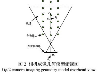 相机成像几何模型俯视图如图2所示。取图像传感器所对地面镜头中点O1为坐标原点,图像传感器上点的坐标用(Xa,Ya)表示。O1对应的田间平面的实物点O2为视场平面坐标原点,田间平面上点的坐标用(Xb,Yb)表示。h为自动识别除草机的镜头焦点离地高度,f为自动识别除草机的镜头焦距,z为自动识别除草机的镜头焦点到O2的距离,∮为自动识别除草机的相机主光轴前倾角度,d为自动识别除草机的镜头焦点到O2的水平距离。代表图像像素宽度, 为图像像素单位高度。
