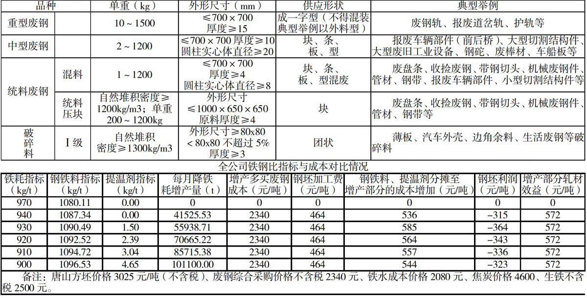 内部回收废钢主要以非生产检修拆除废钢以及生产线产生的废钢为主,大多数内部回收废钢需要再次加工,达到合格尺寸才可以装槽输出。外部采购废钢以外部生活废钢及工业回收废钢为主,均为合格废钢,可以直接装槽输出。内外部回收废钢主要有以下料型及标准: