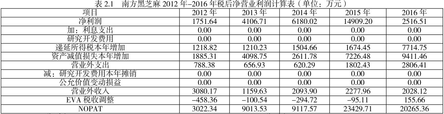 南方黑芝麻2012年-2016年税后净营业利润计算过程如下表所示。