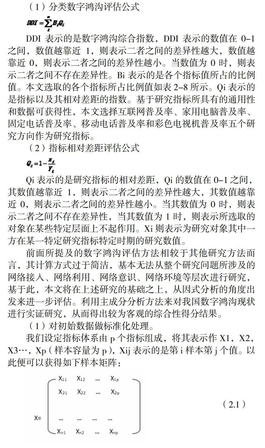 相对于发达国家而言,我国经济尚处于发展阶段,数字鸿沟问题也是近几年才刚刚得到重视。就当前形势而言,我国31个省份城乡以及同经济繁华省市之间的数字鸿沟现象均十分明显。我国当前该问题的现状严重与否?它能够导致国内在经济、社会各个方面激起多大波澜?怎样缩减数字鸿沟问题?诸如此类的问题,现在都已然成为迫切需要突破的困境了,并且这将直接与我国能否有效推进信息化进程以及能否实现经济良性发展挂钩。想要将这些问题化解,那么目前首当其要的就是采取相应手段来将我国的数字鸿沟现状进行定量评估。